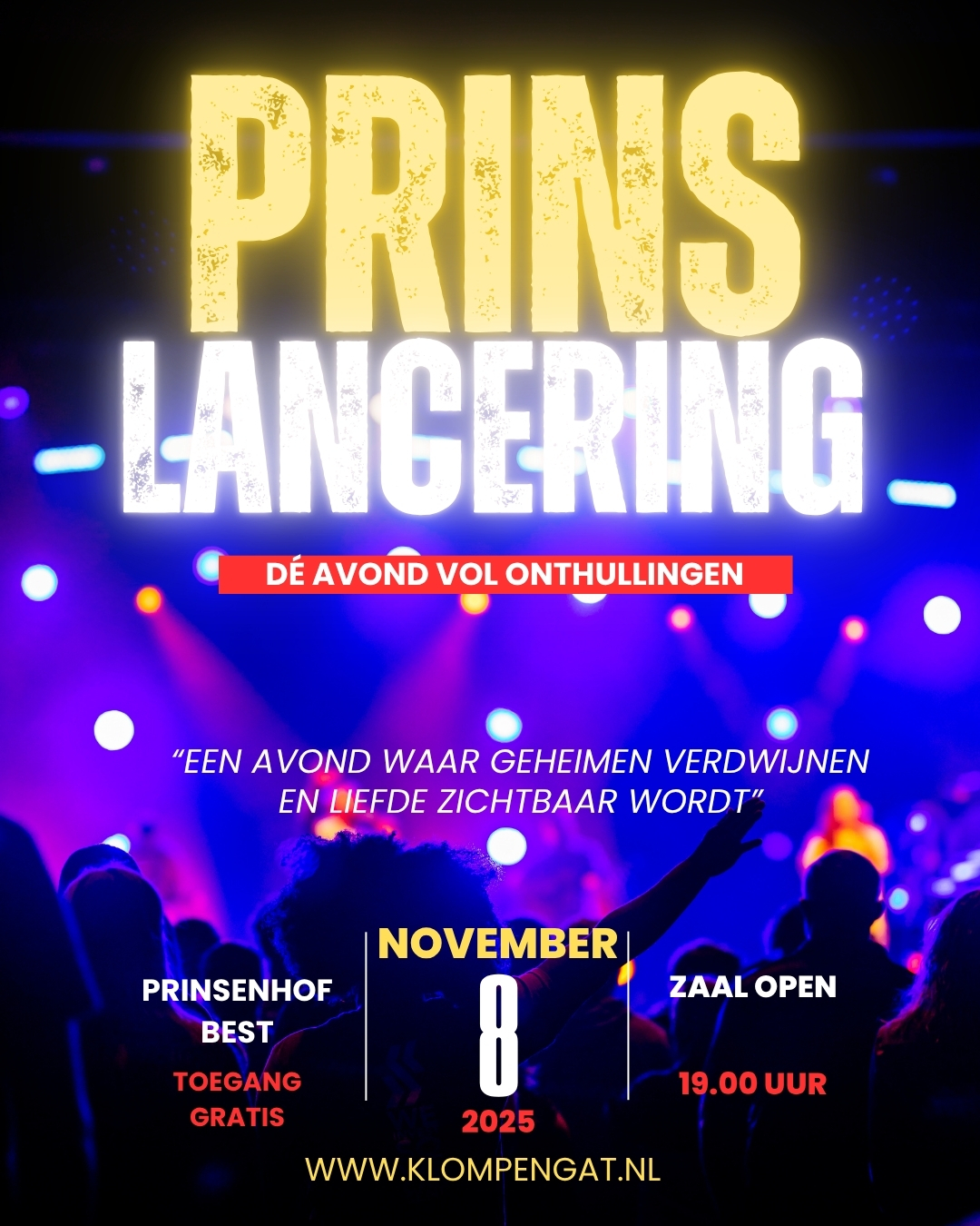 Vanaf 19.00 uur openen de deuren van de Prinsenhof en is iedereen welkom de toegang is gratis. De avond belooft een ware happening te worden, vol muziek, sfeer en natuurlijk dé onthullingen waar het hele dorp op wacht.